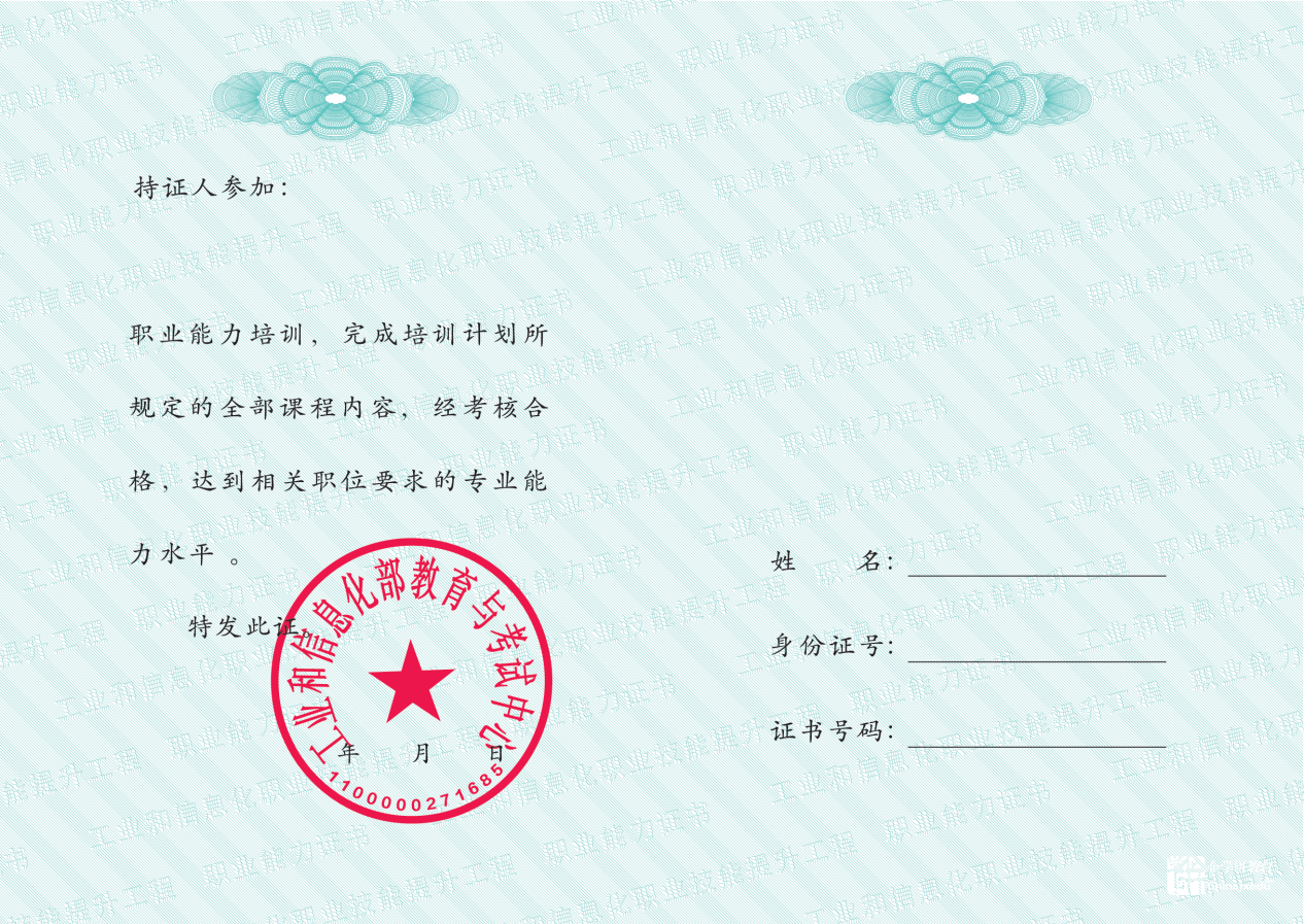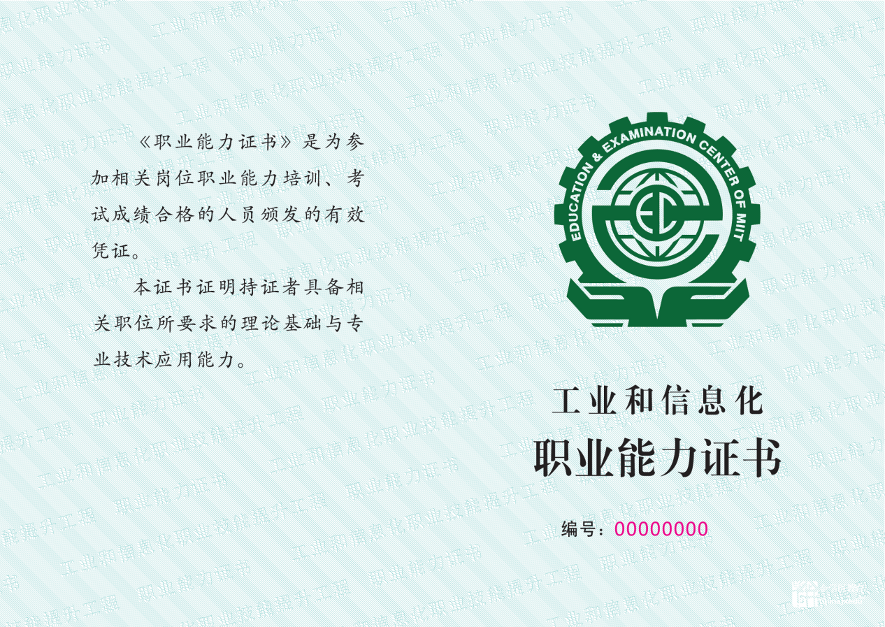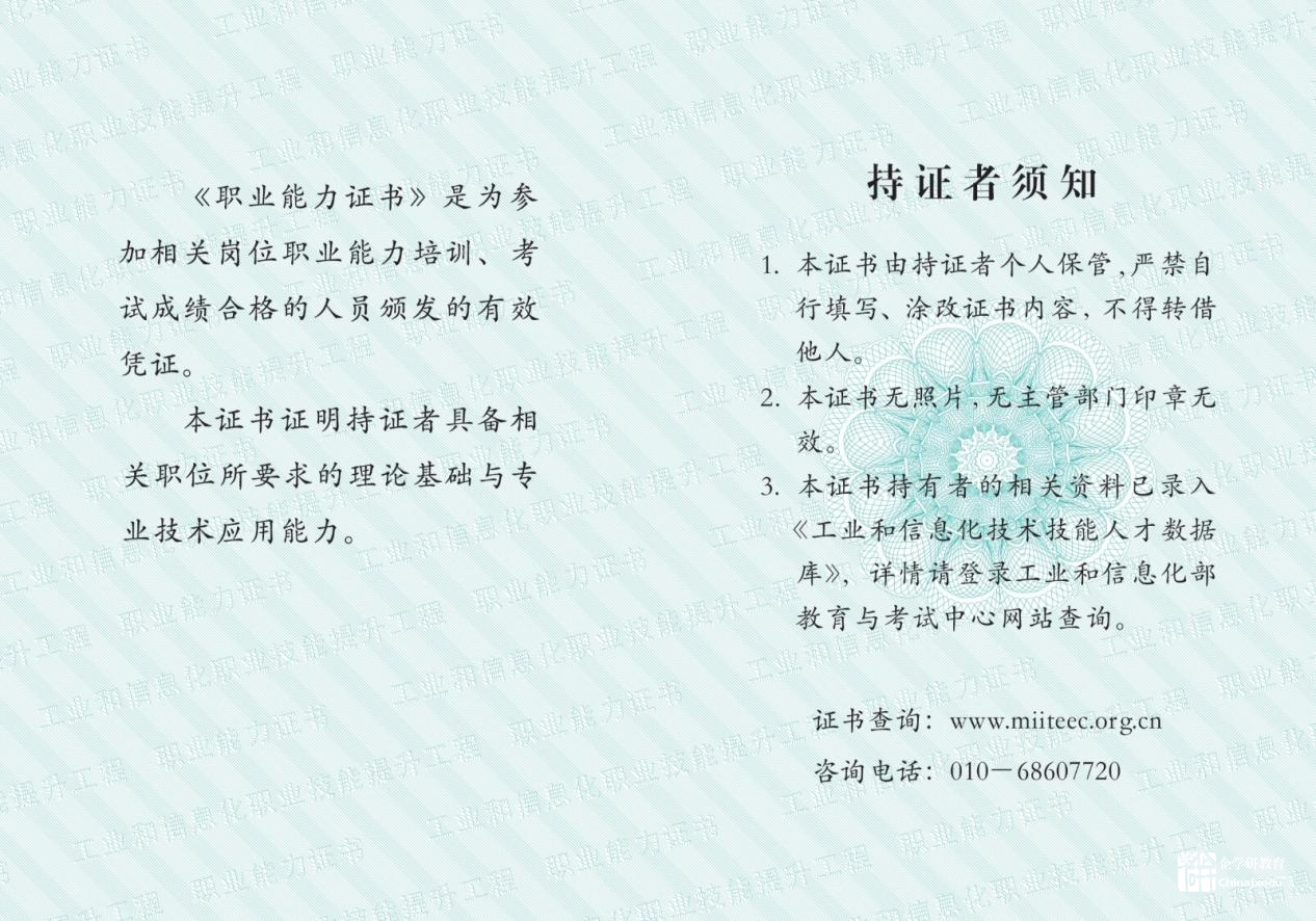 本證書持有者的相關資料已錄入《工業和信息化技術技能人才數據庫》,詳情請登錄工業和信息化部教育與考試中心網站查詢,